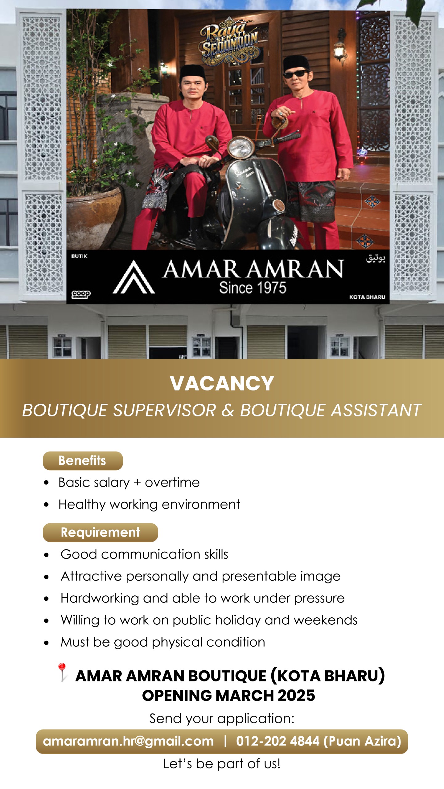 Jawatan : BUTIK SUPERVISOR & BUTIK ASSISTANT