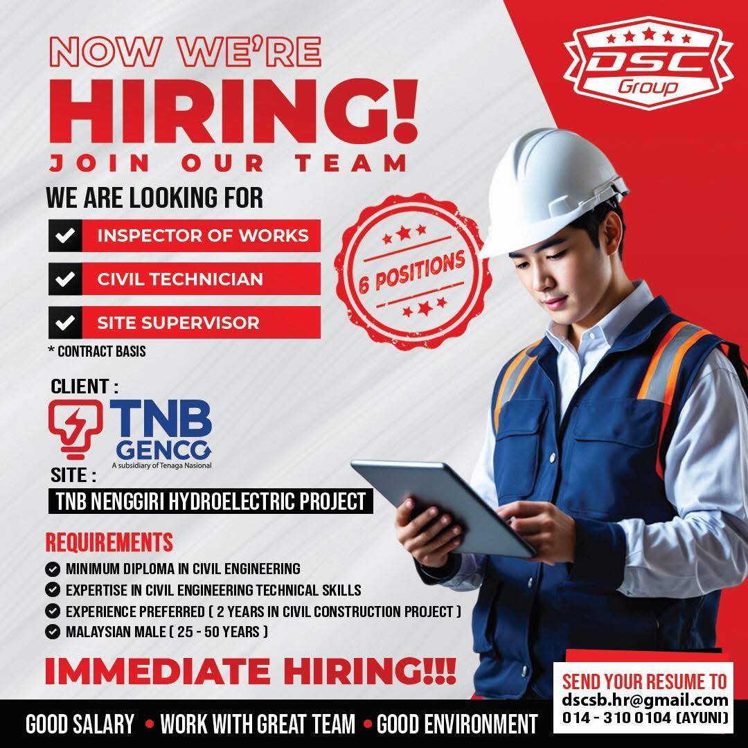 Kami sedang mencari 6 individu berpengalaman sebagai Civil Inspector of Works untuk ditempatkan bersama Engineer Site Team di bawah TNB Power Generation Sdn Bhd (TPGSB).