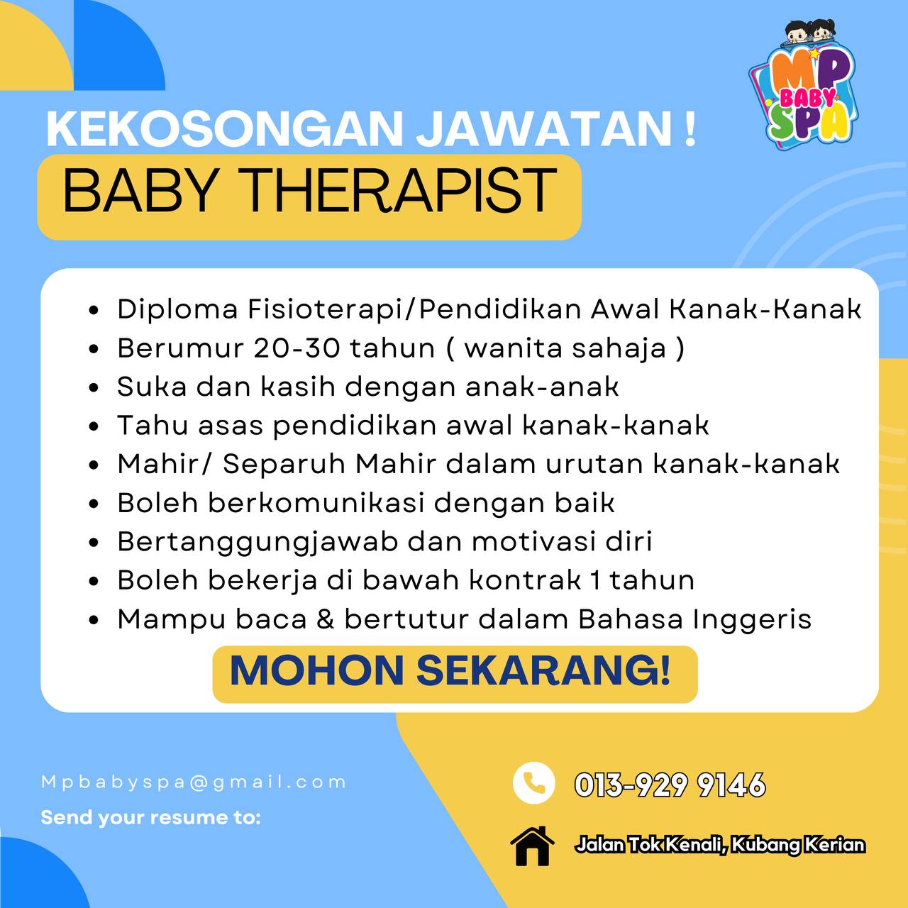 Jawatan *BABY THERAPIS/FISIOTERAPI & CONTENT CREATOR* dibuka untuk sepenuh masa di MP Baby Spa Kubang Kerian.