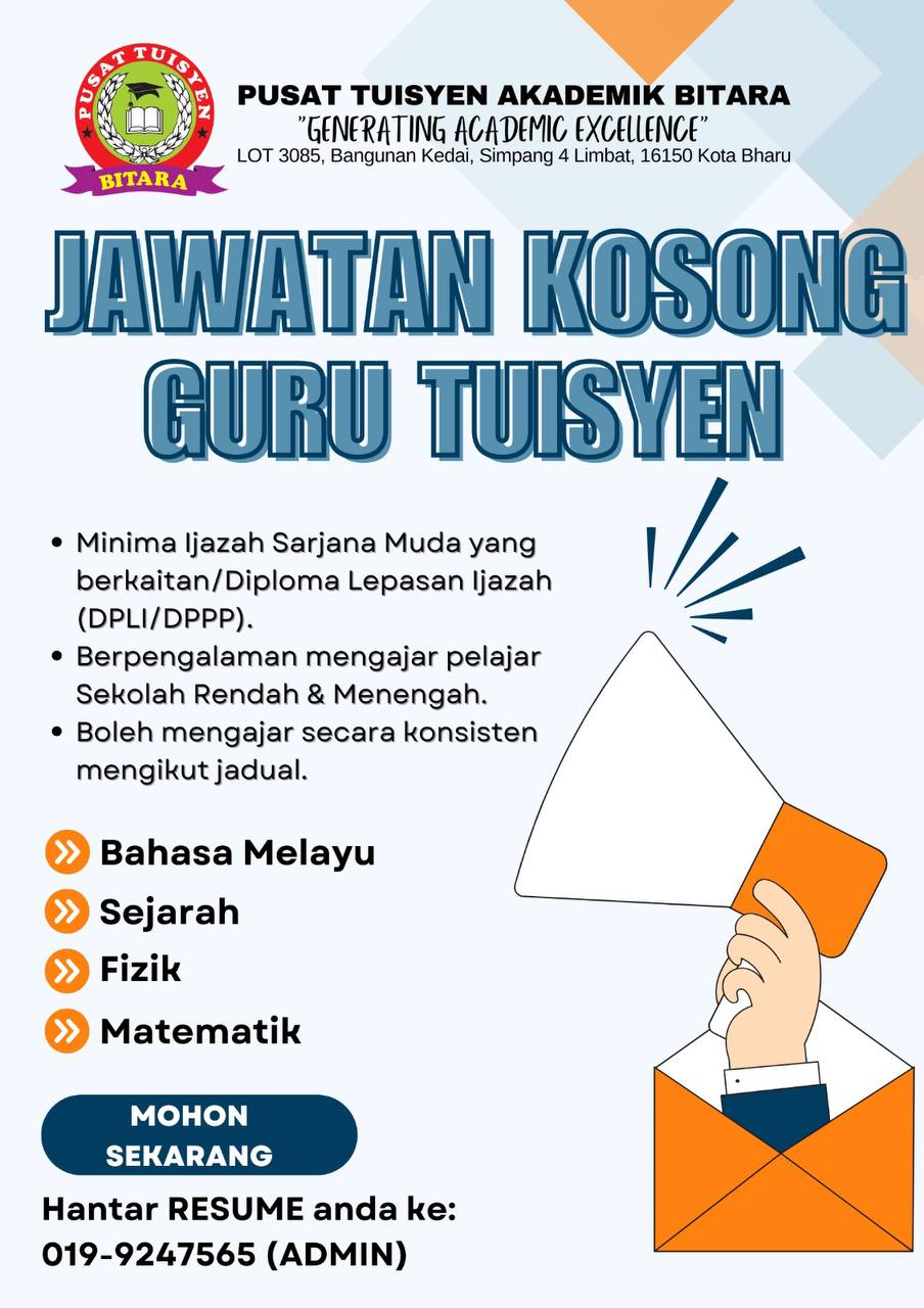 Pusat Tuisyen Bitara sedang membuka peluang kepada individu yang berminat dan berkelayakan untuk menyertai pasukan kami bagi sesi 2026.